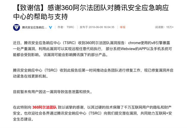 騰訊方面在致謝信中稱,近日,騰訊安全應(yīng)急響應(yīng)中心(TSRC)收到 360 阿爾法團(tuán)隊(duì)漏洞報(bào)告:chrome使用的v8 引擎暴露一處嚴(yán)重漏洞,利用此漏洞可以實(shí)現(xiàn)遠(yuǎn)程任意代碼執(zhí)行, 部分系統(tǒng)Webview的APP以及手機(jī)系統(tǒng)可能都會(huì)受到影響。 該漏洞可能會(huì)影響騰訊旗下的部分產(chǎn)品。騰訊安全響應(yīng)中心收到此報(bào)告后第一時(shí)間推動(dòng)業(yè)務(wù)團(tuán)隊(duì)進(jìn)行修復(fù)工作,現(xiàn)已修復(fù)漏洞并啟動(dòng)緊急在線更新機(jī)制。目前暫未有用戶因這一漏洞導(dǎo)致信息泄露和損失。